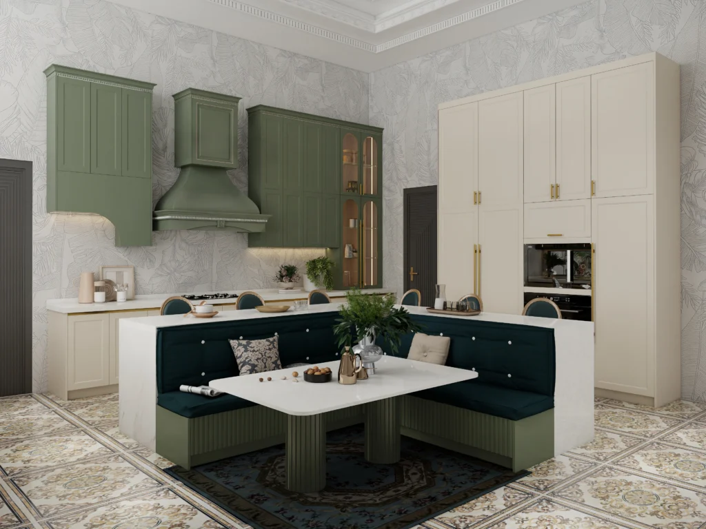 هذا يحافظ على تماسك المطبخ مع إضافة نقطة محورية. وهو فعال بشكل خاص في المطابخ المفتوحة التي تتدفق إلى مناطق المعيشة أو تناول الطعام.