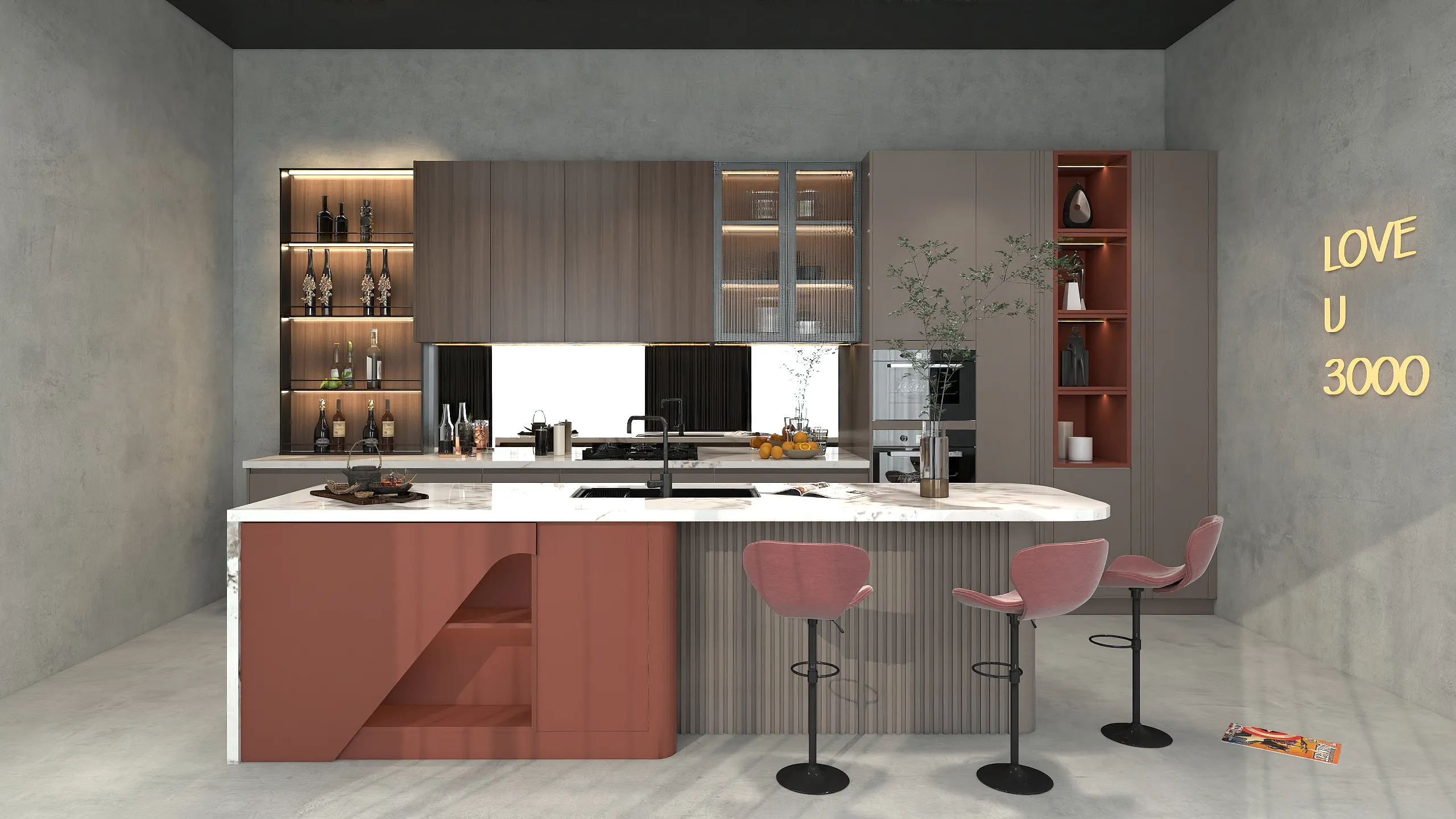 - خفة معمارية: لتعويض الوزن البصري للجزيرة، توفر مقاعد البار الشفافة "الشبحية" مقاعد عملية تختفي بصريًا، مما يضمن بقاء التركيز على نسيج الرخام. في الأعلى، يضفي السقف الشريطي الخطي إيقاعًا معماريًا ويجذب الأنظار نحو المنظر الخارجي.