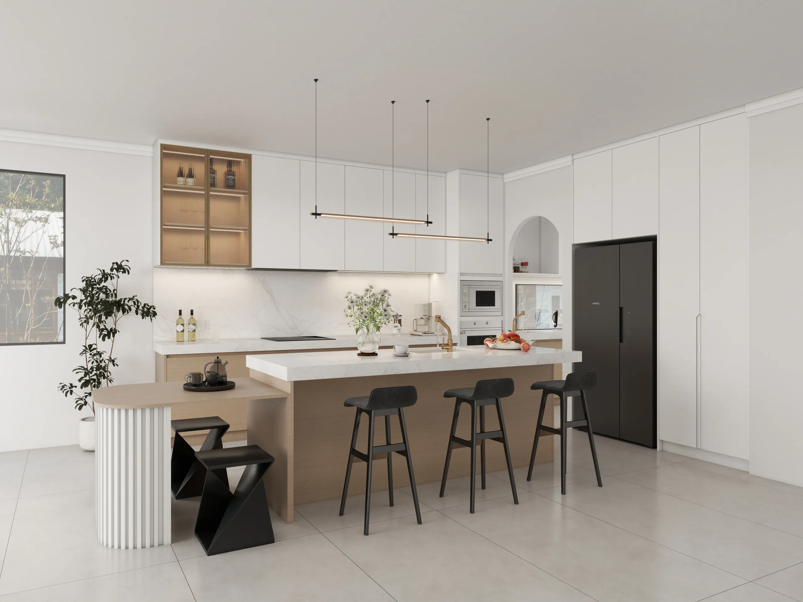 - تدفق سلس بين الداخل والخارج: تعمل الجزيرة الشاسعة ذات الشلال كنقطة التقاء اجتماعية، وتقع بجانب أبواب زجاجية ممتدة من الأرض إلى السقف. يتيح هذا التصميم الاستمتاع بإطلالات خلابة على الحديقة وإضاءة طبيعية داخلية، مما يطمس الحدود بين المطبخ والطبيعة بشكل فعال ليوفر تجربة معيشية مجددة للطاقة.