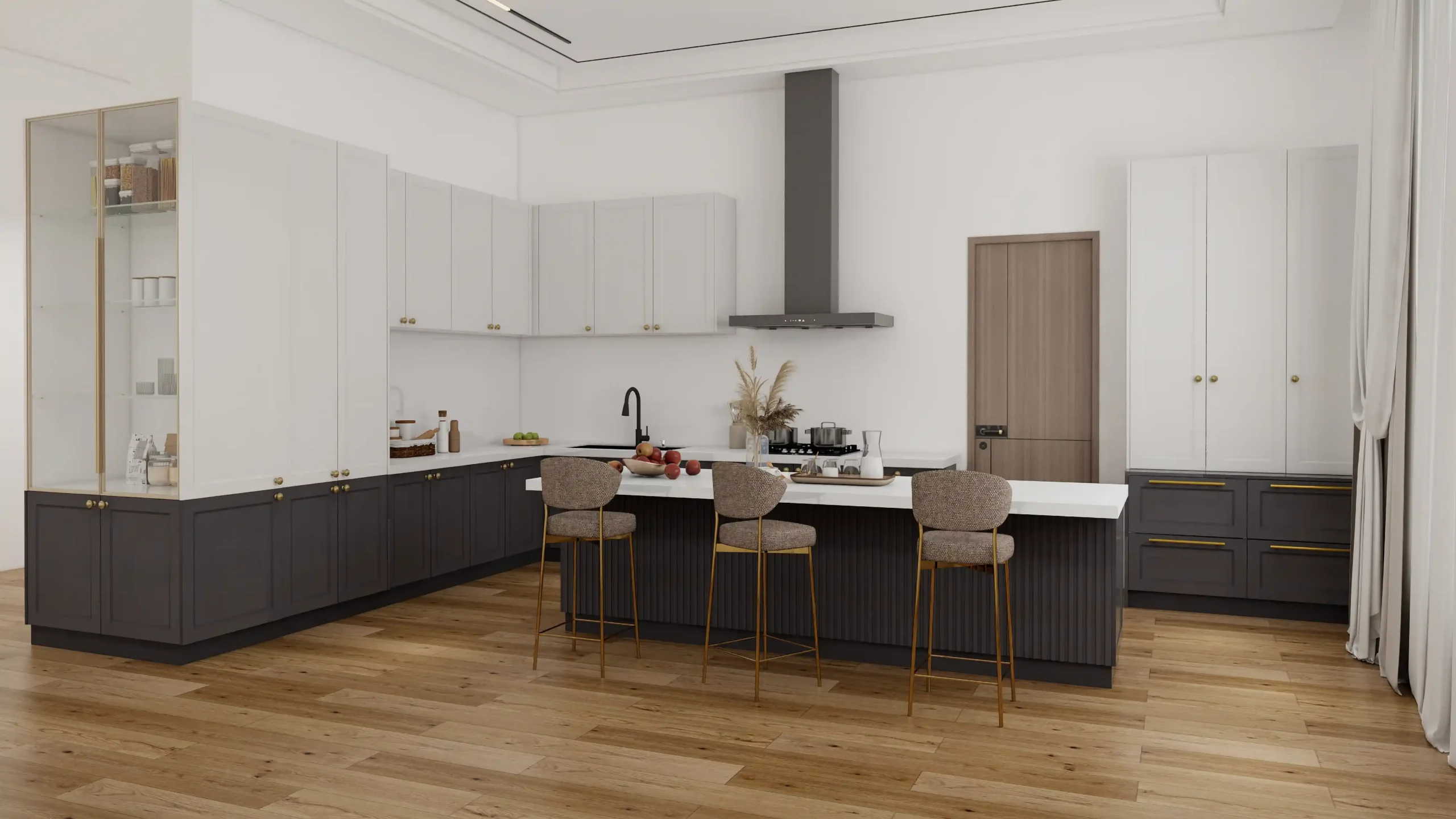 خزائن مطبخ على شكل حرف L من الخشب الرمادي على شكل حرف L مع جزيرة بيضاء