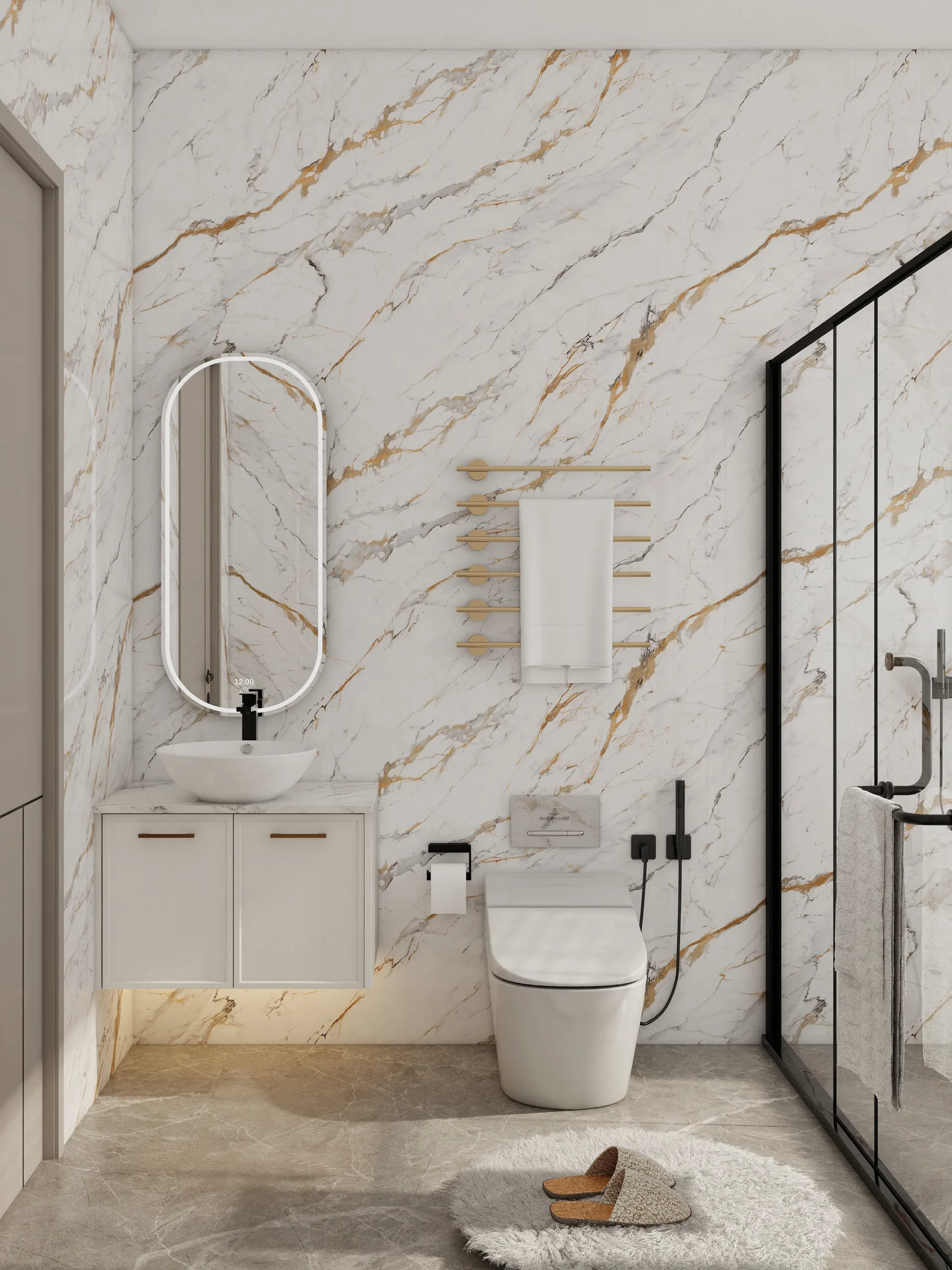 - Integrated Marble and Lighting: Cohesive veined stone walls with LED accents foster warmth and unity, echoing 2025's shift toward natural-material hybrids for timeless appeal.